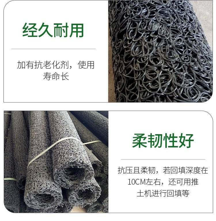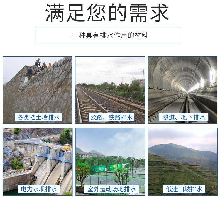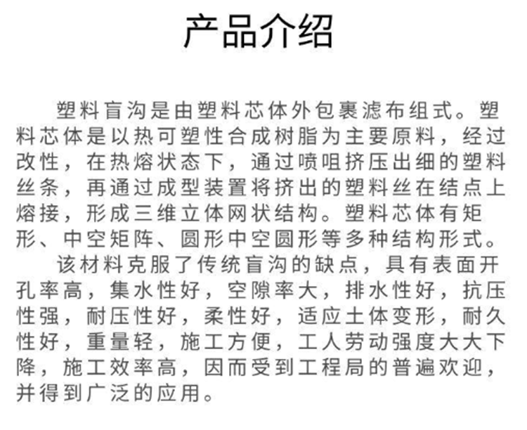 塑料盲沟由于是立体结构,其空隙率为80-95%,构成空间与同且轻便,抗压性能比管结构的树脂强10倍以上,因此,即使因超负荷被压,但由于是立体结构,故残余空隙也达50%以上,不存在不通水的问题,无需考虑会被土压力压坏。是将热塑性合成树脂加热溶化后通过喷咀出纤维丝叠置在一起,并将其相接点熔结而成的三维立体多孔材料。表面开孔庇为95-97%,是有孔管的5倍以上,是树脂网格管的3-4倍,表面吸水率高。抗压强度大,250KPa压力下,其压缩率低于10%。加有抗老化剂,***,在水下,土中等处入置几十年也能确保。抗压且柔韧,对于弯道等曲位也能施工,十分轻便,若回填深度在10cm左右,还可用推土机进行回填等。由于有以上特点,故对以往盲沟出现的各种问题,如不均匀沉降或因超载引起部分闭塞,被压坏空隙全无引起功能中断的问题,可通过塑料盲沟材解决。由于采用热熔化成型而不使用粘结剂,故不会因粘结剂老化及剥离等而引起崩坏。