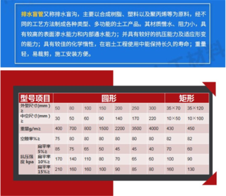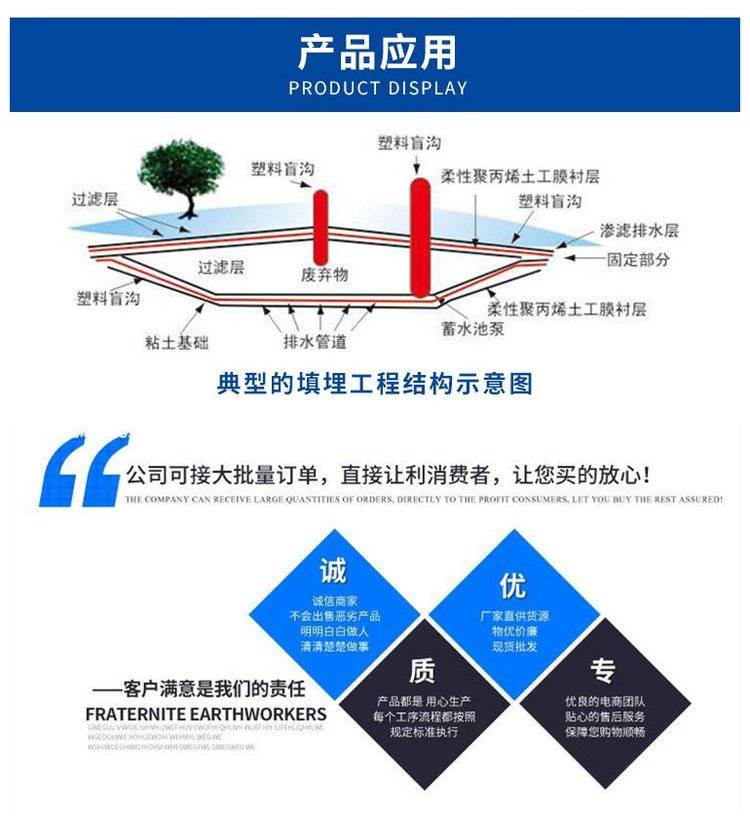 泰安鼎诺土工有限公司生产的塑料盲沟材抗压强度高,且回复性好,一般在250KPa(25T/m2)压力下断面空隙率仍保持在60%以上,且压力卸除后,可恢复原状。不存在由于超载或其他原因排水失效的问题。耐久性好塑料盲沟材,采用防老化配方,其性能,具有抗紫外线、***、***等特点,因此塑料盲沟材在水下、土中几十年也能保持结构并保持集排水性能。表面开孔率表面开孔率是指盲沟材料表面开孔的面积与表面积的比率,一般用%表示。是反映盲沟材料吸水能力的一项重要的性能。一般来说,表面开孔率越大,吸水性能越好越不容易淤堵。表面开孔率太小就容易淤堵,透水不畅。
